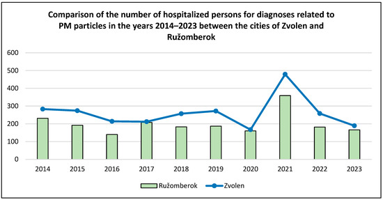 Comparison of the numbers of hospitalized persons for diagnoses caused by PM particles in the years 2014–2023 between the cities of Zvolen and Banská Bystrica.