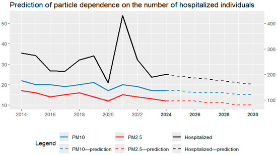 The gathered data were used to predict future PM concentration trends in Zvolen and to estimate hospital admission trends for respiratory diseases. The methodology focused on identifying correlations between PM10/PM2.5 concentrations and hospital admissions for the period 2014–2023, serving as the basis for projections through 2030. Input data on particulate matter concentrations were obtained from SHMÚ, while hospitalization statistics were sourced from NCZI. These data were processed and visualized using the R programming environment, employing functions such as predict(), lm(), and ggplot(). Given the nature of the data, a linear regression model was selected to analyze the relationship between hospital admissions and PM concentrations. The model was validated through favorable R2 values, low p-values, and high F-statistics, supporting its reliability in predicting hospitalization trends for the period 2024–2030.