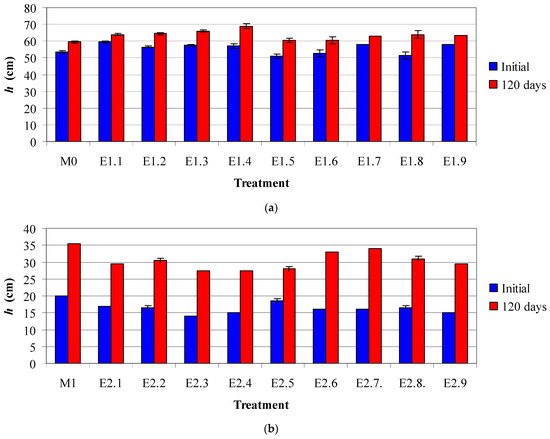 - Compared to the initial mean values of h (51.0–59.5 cm for lavender and 14.0–20.0 cm for lavandin), the mean values of h at 120 days were 1.09–1.24 times higher for lavender (59.5–69.0 cm) and 1.51–2.13 times higher for lavandin (27.5–35.5 cm).