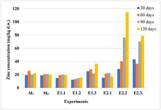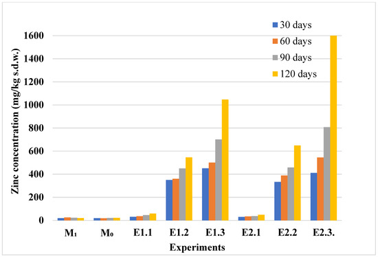 Zinc concentration in soils from control and Zn-contaminated experiments, measured at 30, 60, 90, and 120 days. Experimental codes (e.g., M0, M1, E1.1–E2.3) correspond to specific contamination levels, as described in Table 1.