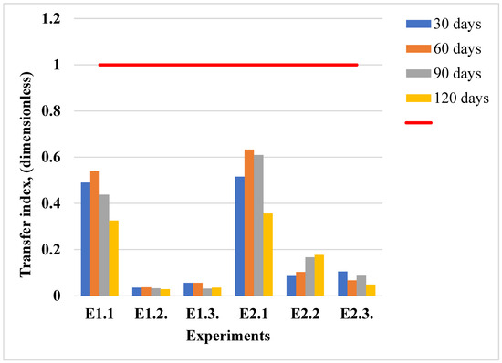 The distribution of zinc in the plant and soil compartments showed a clear temporal pattern, reflecting enhanced accumulation over time, as shown in Figure 4 and Figure 5. The bioaccumulation behavior of zinc in lavender plants appears to be influenced by the duration of the exposure. The transfer index (TI), calculated as the ratio between the zinc concentration in plant tissues and that in the corresponding soil, is shown in Figure 6. TI values exceeding 1 suggest active zinc bioaccumulation; however, across all six experimental conditions, the highest TI was recorded at 60 days in lavandin (E2.1). Over time, TI values declined and remained below 1, indicating a limited accumulation capacity. A TI value of 1 marks the threshold for bioaccumulation, and under these conditions, both lavender species predominantly acted as excluders for zinc. Additionally, the zinc concentrations in plant tissues did not surpass the normal value (VN = 150 mg/kg [40]) during the entire experimental period (Figure 4).
