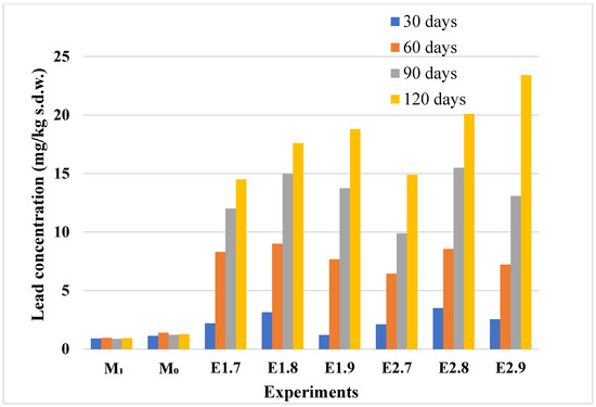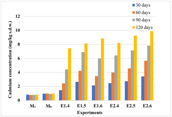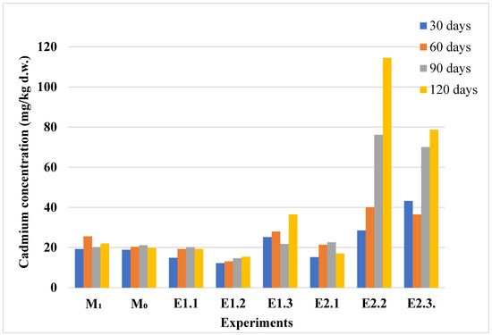 Under control and low-contamination conditions (M0, M1, E1.1, E1.2), cadmium concentrations in lavender tissues remained low and relatively stable, showing limited uptake from the soil. These findings are supported by the data shown in Figure 7. A significant increase in cadmium accumulation was observed in experiments E2.2 and E2.3, particularly after 90 and 120 days of exposure. These findings suggest that lavender plants have the capacity to accumulate cadmium more readily than zinc, especially under higher soil contamination conditions. To better understand the cadmium uptake behavior observed in plants, the corresponding cadmium concentrations measured in the soil samples are presented in Figure 8.