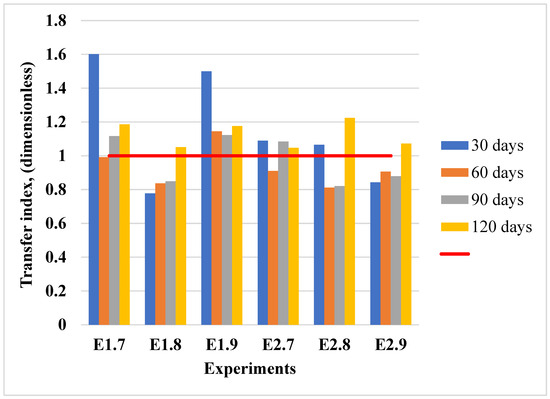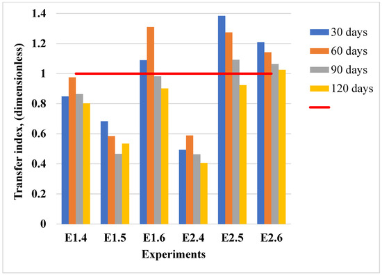Transfer index values for zinc translocation from soil to plants in the conducted experiments. The red line at TI = 1.0 serves as a reference threshold: values above 1 indicate efficient zinc movement from roots to aerial parts, while values below 1 reflect limited translocation and higher root retention of zinc.
