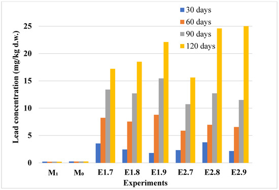All data were collected over a 120-day period at four exposure intervals (30, 60, 90, and 120 days) for both the control and contaminated samples, allowing for the temporal analysis of accumulation dynamics. This method enables the identification of trends and thresholds relevant to phytoremediation efficiency.