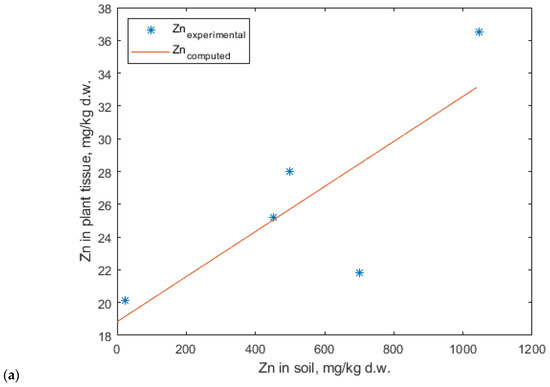 The modified Mitscherlich model provided poor fitting results across all experimental data sets tested. The values of the model parameters and the corresponding determination coefficients (R2) are summarized in Table 7. From the fitting results, it can be observed that notable similarities exist between the two lavender species. Although the model parameters differ slightly and the plants accumulate somewhat different amounts of heavy metals, the empirical models that yield the best fit for lavender also perform the best for lavandin.
