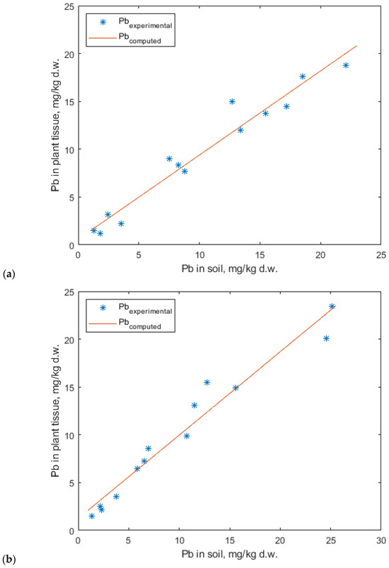 Linear regression model for lead uptake in lavender (a) and lavandin (b).