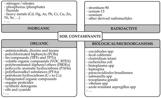 Overall, soil contaminants can be classified into the following categories: biological, radioactive, organic and inorganic contaminants [4,10,11], as shown in Figure 1. The characteristics of the contaminants in these different categories will be discussed in more detail in the next section. In recent years, increasing attention has been given to soil contaminants of emerging concern (CECs), which include nano- and microplastics (NMPs), PFAs (polyfluoroalkyl substances), heavy metals (HMs) and additives such as biphenyls and phthalates [3], due to their increasing presence in soils and also to their negative effects on plants and animals, even at low concentrations. Some of the most common persistent soil contaminants and their major effects will be described in detail in Section 3.