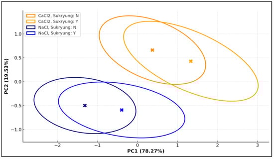 PCA Ellipse Plot of Soil Chemical Properties across Deicer Treatments and Planting; Colored ellipses represent the 95% confidence regions of each treatment group in the PC1–PC2 space. Blue indicates NaCl-treated groups and orange indicates CaCl2-treated groups. Circle markers represent non-planting treatments, and squares represent planted treatments. X-shaped markers show the group centroids, and greater separation between ellipses suggests stronger treatment differentiation.