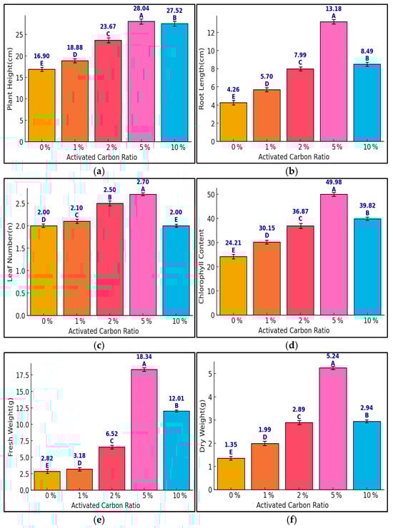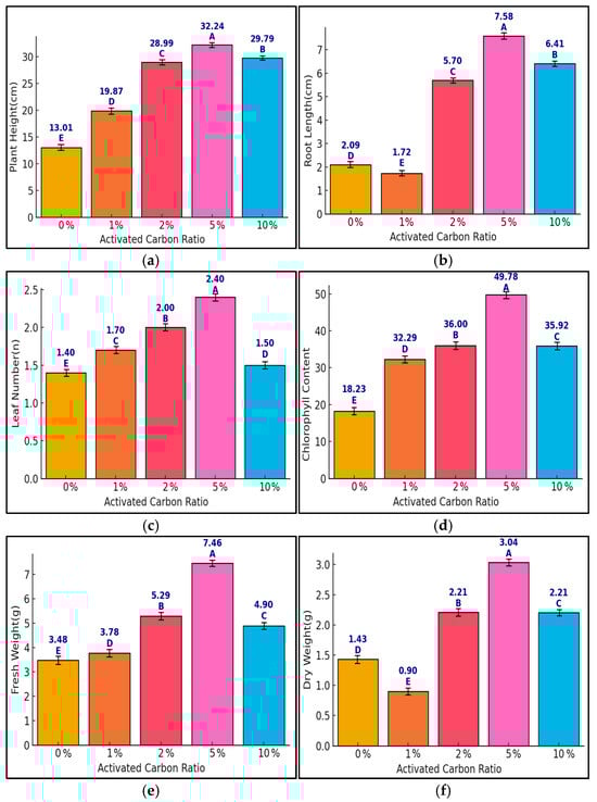 Growth responses of Pennisetum alopecuroides to different activated carbon (0, 1, 2, 5, and 10%) ra-tios under CaCl2 stress across six growth parameters ((a) plant height, (b) root length, (c) leaf number, (d) chlorophyll content, (e) fresh weight, (f) dry weight). Bars show means ± standard error (SE), and capital letters (A–E) represent statistically significant differences based on Tukey’s HSD test (p < 0.05). Sample size: n = 5. Plant height, root length, and leaf number are presented as net growth increments (Δ) from the baseline, while other indicators represent final values.