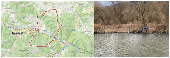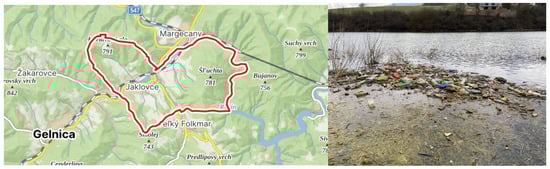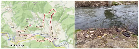 The Kluknava area is a significant source of plastic and organic waste, which mainly comes from illegal waste dumps located near the Dolinský potok and Hornád tributaries. During floods, there is an intensive runoff of waste into the main stream, which subsequently enters Ružín and significantly degrades the quality of surface waters. This situation is documented in Figure 2, which shows the geographical location of Kluknava village and the accumulation of waste in the Hornád.