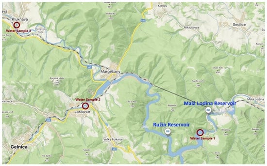 Sampling took place on 3 March 2024 and included three key sites that represent different types of environmental burdens within Ružín. The sample from the Ružín water reservoir was obtained at 12:32 P.M. to represent the main accumulation area, where long-term sedimentation and eutrophication processes are manifested. A sample from the Hnilec River near Jaklovce, obtained at 1:26 P.M., reflects the impact of industrial and municipal sources of pollution, while this site is an important entry point of contaminants into the reservoir. The sample from the Hornád River downstream from Kluknava River, obtained at 1:59 P.M., represents a hydrologically dynamic area with a high inflow of sediments that transport illegal waste dumps, agricultural runoff and urbanization influences.