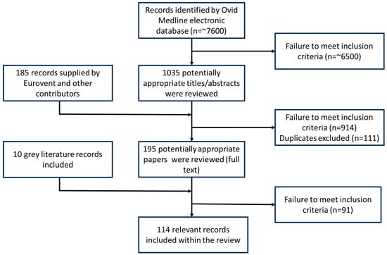 This scoping review was initiated through the Knowledge and Library Services (KLS) at the UK Health Security Agency (UKHSA), to identify peer-reviewed, preprint and grey literature since 1990 from high-income countries in Europe, North America, Japan, South Korea, Taiwan, Australia, and New Zealand. Eurovent provided additional articles at the initial stage. The inclusion and exclusion criteria were divided into six categories, as shown in Table 1, and are included in Supplementary Materials S2 together with the search string used by KLS.