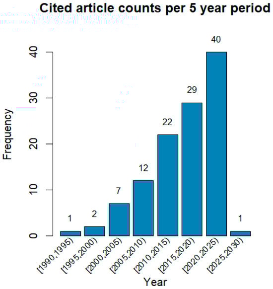 After screening on title and abstract with the help of the online screening platform Rayyan, 1035 records were identified and further screened on full text. A total of 114 relevant records were eventually identified and used within this literature review, including individual studies, review articles and grey literature. To test the screening process, Supplementary Materials Figures S1 and S2 show the most cited studies within the sample of papers and the studies which cite the most papers from within the sample, respectively. Figure 2 depicts the year trend of cited articles, showing the increasing research interest in this area.