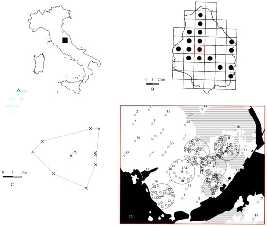 (A) Black square: location of Colfiorito plateaus in the Apennines; (B) distribution of Euphydryas a. provincialis in the Colfiorito plateaus [26]; red square = study area; (C) example of nesting patch obtained using the MCP algorithm; black crosses = nests; red dot = nesting patch centroid; (D) study area in detail; dotted circles = MRRAs, mark release recapture areas (buffer of 150 m from nesting patch centroid); black regions = geographic barriers for E. a. provincialis; horizontal lines = forests, wood, pre-wooded communities; white regions = open land (pastures, crops, abandoned crops); squares = marked individuals; circles = recaptured individuals; crosses = random monitoring stations of marked individuals.