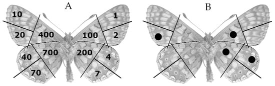 (A) Insect marking system according to Brussard’s (1971) modification of Earlich and Davidson’s (1960) “1-2-4-7” system described by Southwood (1978). (B) Marking example of the 324th specimen (200 + 100 + 20 + 4 = 324).