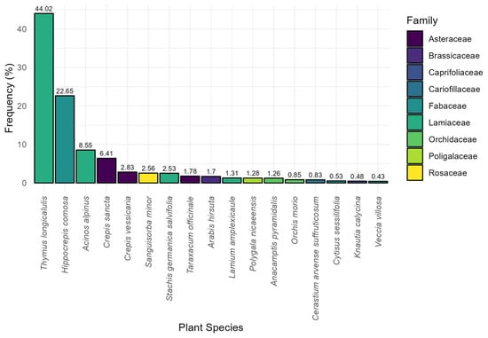 Most of the adults were captured on Thymus longicaulis longicaulis, which accounted for 44.02% of all the recorded observations made (n = 1432), followed by Hippocrepis comosa (22.65%, n = 737). Several other plant species were recorded at lower frequencies, including Sanguisorba minor (2.56%, n = 83) and Taraxacum officinale (1.78%, n = 58). Other species such as Acinos alpinus (8.55%, n = 278) and Crepis sancta (6.41%, n = 208) also contribute significantly to the presence of adults (Figure 3). Knautia calycina (C.Presl) Guss. (=K. purpurea auct. Fl. Ital. p.p.), known as a key larval host plant, in bloom during the capture sessions, was only marginally represented in adult captures (0.48%, n = 16), suggesting that adults do not frequently use it as a nectar source.