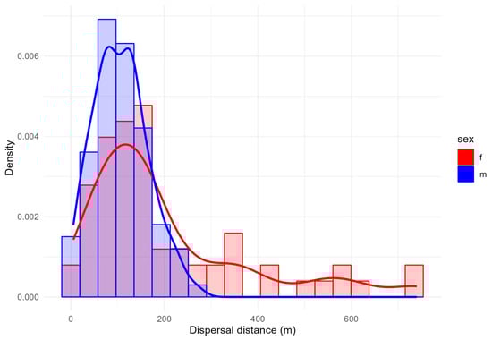 Distribution frequencies of dispersal distances between sexes.
