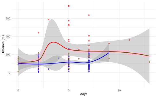 The relationship between dispersal distances and time since marking in insects, particularly in Lepidoptera, has been a subject of interest in the scientific literature. In this regard, previous studies have shown that some butterfly species exhibit a correlation between the distance travelled and the number of days since marking. For example, research on Parnassius apollo has demonstrated that individuals tend to move over longer distances as time increases, suggesting an exploratory behavior linked to resource or mate searching [51]. However, this relationship is not universal among all butterfly species. In some populations, dispersal distance may be influenced by environmental variables, habitat availability, and species-specific ecological traits [48,51,52,53]. Therefore, while some species exhibit increasing distances over time, this relationship may be less evident or even absent in others.
