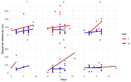Relationship between dispersal distance per patch and days since marking for males (blue) and females (red). In females, for patch 5, we have a significative dependence between days and dispersal distance over time.