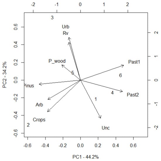PCA biplot illustrating the distribution of patches along PC1 and PC2, highlighting the ecological distinction between source (2, 3, 5) and sink patches (1, 4, 6).