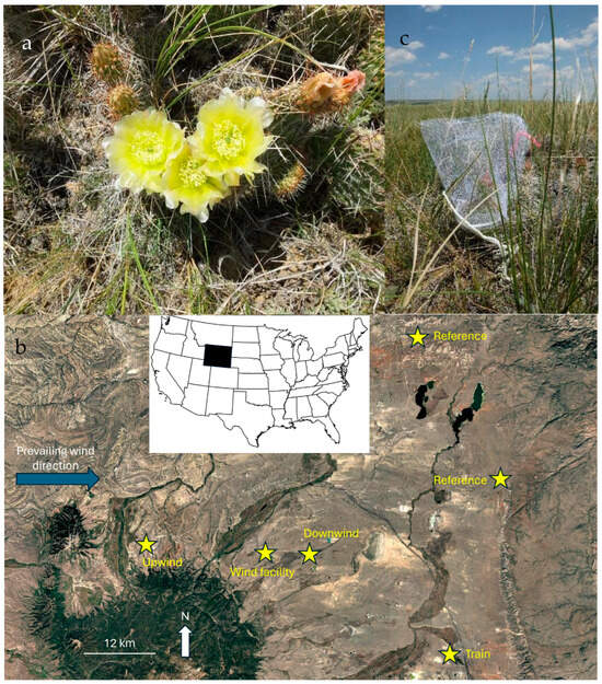 We investigated seed-set of Plains pricklypear (Figure 1a) at five sites in southern Wyoming, United States, to measure seed production at varying distances from an active wind facility and railways to measure the degree to which infrasound affects pollen transfer. We worked at three sites near an operating wind facility with 66 turbines capable of producing 99 MW of power in 2016. Winds primary blows out of the west, southwest and south (decreasing order). The upwind site was 21.5 km west of turbines, the wind facility site was amongst active turbines and the downwind site was 4.5 to 6.6 km east of the wind facility. We measured the seed-set at a site 2 km from active an active railway where 45–60 trains passed daily and two reference sites >20 km from a source of infrasound (e.g., railways, wind facilities, towns and major roads) in 2020. All sites were selected based on their similar landscape characteristics to the wind facility, which was located in sagebrush steppe and received ~30–36 cm of precipitation annually [61,62].