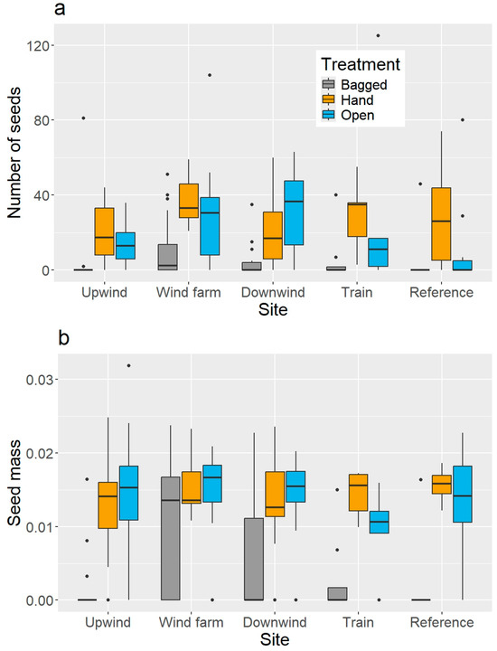 The (a) number, (b) mass and (c) percent of viable seeds from Plains pricklypear (Opuntia polyacantha) varied among treatments and sites. Flowers were bagged to assess self-pollination, pollinated by local pollinators in the open treatment and hand-pollinated to measure seed characteristics when pollen was not limiting. The upwind and downwind sites were near an active wind facility, the train site was near a railway and the reference site was distant from anthropogenic sources of infrasound.