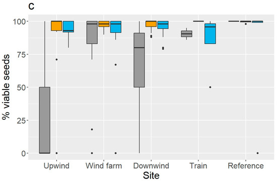 We estimated differences among treatments and with distance to infrasound using generalized linear mixed-effects models to estimate the degree to which sound from wind turbines and railways altered seed-set. We estimated how treatment, distance and source of infrasound altered the number of seeds, the mass of seeds and the percent of viable seeds produced. The data were not normally distributed so we inspected histograms and used the fitdistrplus package [65] in Program R [66] to find which distribution best represented the data. We used the negative binomial distribution for seed count (mixed_model; Package GLMMadaptive) [67], the gamma distribution for seed mass (glm; Package lme4) [68] and the quasipoisson for the proportion of viable seeds (glmmPQL; Package Mass) [69]. We included treatment, distance to source (i.e., turbines or railway) and source of sound (turbine, railway or none for reference site) as fixed effects and site as a random effect. We did not include site as a random effect for seed mass because site explained little variance in the model. Generalized linear mixed-effects models produce values for each level of a categorical variable (e.g., treatment) and we reported the range of t-values and p-values for each level. We estimated differences among treatments using the estimated marginal means (emmeans) package [70] to calculate which treatments differed (α ≤ 0.05). Data were summarized using the plyer package [71].