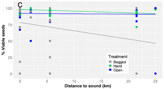 The percent of viable seeds produced in the bagged treatment was lower than those in the hand-pollinated and open treatments (Figure 2c). In fact, >90% of seeds were viable in the hand-pollinated and open treatments, and 71% were viable in the bagged treatment on average. Distance to the source of infrasound (Figure 3c; Table 1) and the source of infrasound did not explain the variation in the percent of viable seeds (Figure 2c; emmeans, p ≥ 0.86). A lower percent of viable seeds were produced in the bagged treatment compared to the hand-pollinated and open treatments (Figure 2c; emmeans, p ≤ 0.002). The percent of viable seeds in the open and hand-pollinated treatments did not differ (emmeans, p = 0.57), further suggesting that pollen was not limiting O. polyacantha at our sites.