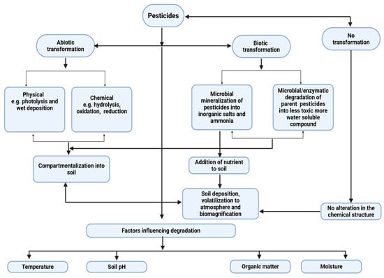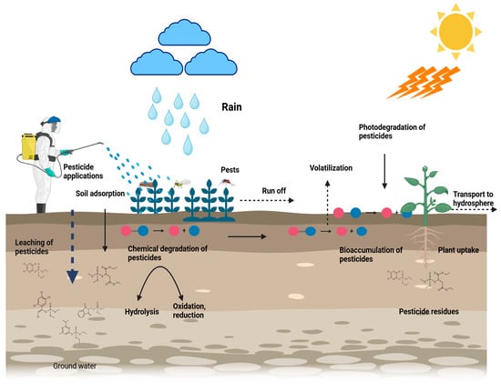 Generally, the degradation of pesticides depends on various factors of the soil and soil processes, such as adsorption, plant uptake, surface and subsurface transport, microbial degradation, and chemical hydrolysis. Pesticides subjected to the movement away from their point of application are either degraded or not degraded, detoxified, or removed with the harvested crops [1]. Pesticide degradation pathways and the fate of pesticides are complex, depending on the nature of the chemicals, their structure, volatility, solubility, formulation, and properties of the soils involved. The breakdown of pesticides can be categorized as transport away, localized losses, and removal of chemicals from the environment [2]. Pesticide degradation in soil occurs through abiotic processes such as hydrolysis, photodegradation, and chemical oxidation, and biotic processes primarily mediated by soil microorganisms that enzymatically break down pesticide compounds into simpler, often less toxic forms [20,21]. Figure 1 explains the detailed mechanism of pesticide degradation in soil.