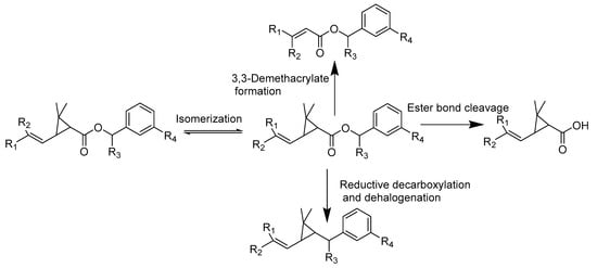 Many studies reported the role of organic photosensitizers in accelerating photochemical reactions, thereby enhancing the degradation rate of numerous chemical compounds. For example, upon exposure to light, pyrethroids can undergo isomerization, followed by transformations such as 3,3-dimethacrylate formation, ester bond cleavage yielding carboxylic acid derivatives, and reductive decarboxylation and dehalogenation (Figure 2). These photochemical reactions contribute significantly to the breakdown of pyrethroids in the environment, ultimately influencing their persistence, toxicity, and impact on soil and water ecosystems [5]. Furthermore, investigating the degradation of Butachlor and Ronstar herbicides under natural sunlight, employing diethylamine as a photosensitizer [23]. The compound containing amines such as diethylamine, triethylamine, and diethylphenylene diamine facilitates photodegradation by generating various reactive species. Similarly, another study reported the significant degradation of Chlorpyrifos and Diuron in the presence of fructose, which acted as a photosensitizer [14]. Furthermore, Fernández-López et al. [24] reported the photodegradation of the Isoxaflutole herbicide using Riboflavin as a sensitizer through processes such as Fenton and photo-Fenton, and their findings indicated photo-Fenton as more efficient in degrading Isoxaflutole. Additionally, the photodegradation of Dichlorvos (DDVP) was reported using stimulated sunlight and dissolved oxygen [15].
