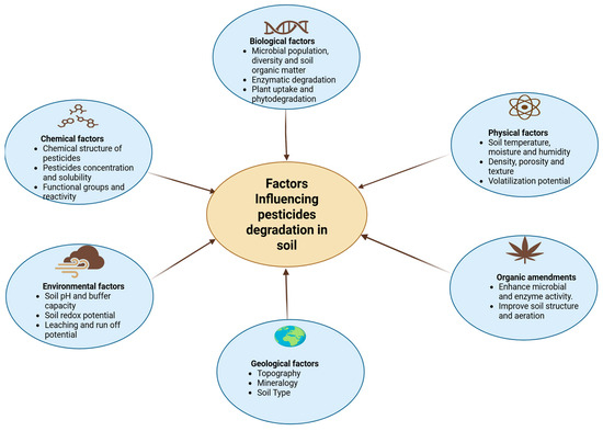 A variety of complex dynamic physical, chemical, and biological processes determine the behavior of pesticides in soil, including sorption-desorption, volatilization, and biological and chemical processes. Figure 4 explains the factors contributing to the degradation of pesticides in soil.