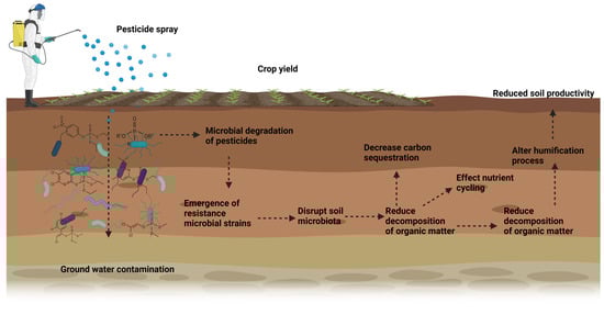 The excessive use of various pesticides to enhance crop yield can also cause soil contamination. Additionally, they can also harm non-target species, including beneficial species [62]. It is impossible to eliminate the pesticides or other pollutants once they enter the environment. The available strategies are limited to either reducing their toxicity or altering mobility to prevent further spread to the ecosystem [145]. The pesticides, after being sprayed on crops, can accumulate on the surface of the leaf or mix with the soil after abscission and alter soil functions [146]. After applying pesticides, they can persist in the soil for weeks to years with higher toxicity than in other ecosystems, thus changing the soil’s physicochemical conditions [60]. Ultimately, pesticides minimize soil fertility, destroy beneficial microbial diversity, and disrupt the biogeochemical cycle with soil chemistry [65].