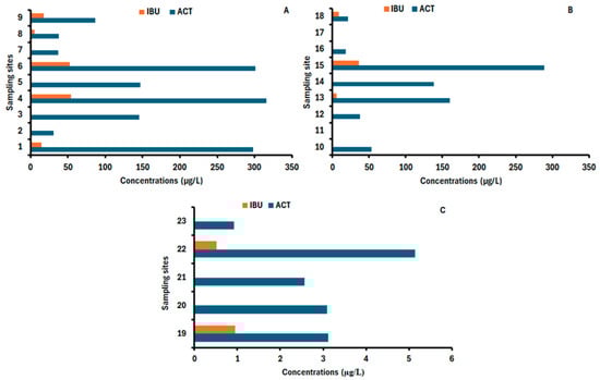 Concentrations (μg/L) of acetaminophen (ACT) and ibuprofen (IBU) in (A) influent wastewater, (B) effluent wastewater, and (C) river water samples collected from selected KwaZulu-Natal sampling sites during the second wave of the COVID-19 pandemic. The sampling sites are as follows: 1―Howick WWTP; 2―Darvil WWTP; 3―Albert WWTP; 4―Mpumalanga WWTP; 5―Hammersdale WWTP; 6―Dassenhoek WWTP; 7―KwaNdengezi WWTP; 8―Umdloti WWTP; 9―Verulam WWTP; 10―Howick WWTP; 11―Darvil WWTP; 12―Albert WWTP; 13―Mpumalanga WWTP; 14―Hammersdale WWTP; 15―Dassenhoek WWTP; 16―KwaNdengezi WWTP; 17―Umdloti WWTP; 18―Verulam WWTP; 19―Umgeni River (Albert Falls WWTP) downstream; 20―Umlazi River (Mpumalanga WWTP) downstream; 21―Umlazi River (Hammersdale WWTP) downstream; 22―Umlazi River (Dassenhoek WWTP) downstream; 23―Umlazi River (KwaNdengezi WWTP) downstream.