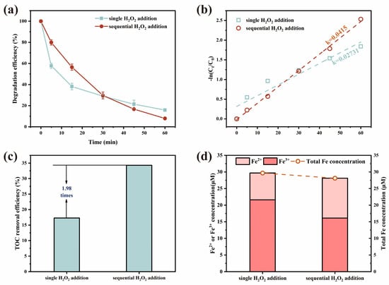 H2O2 is typically added in a single dose in existing studies on co-catalytic Fenton reactions [7,30,31]. However, if the Fe2+ concentration in the co-catalytic Fenton system is insufficient to fully react with the single H2O2 addition, the unreacted H2O2 might enter the Fe3+ co-catalytic reduction zone, undermining the intended compartmentalization [17]. Therefore, a sequential H2O2 addition strategy was necessary to achieve spatial separation of Fe3+ reduction and Fenton reaction. The method of H2O2 addition significantly influenced 4-NP degradation in the ECTPBR (Figure 2a). After 60 min, 84.12% of 4-NP was degraded with H2O2 single addition, whereas H2O2 sequential addition led to a much higher degradation efficiency of 92.30%. In both cases, the degradation of 4-NP followed pseudo-first-order kinetics, with a reaction rate constant (k) of 0.04151 min−1 under H2O2 sequential addition (Figure 2b), an improvement of 51.96% compared to the single addition. This demonstrated that H2O2 sequential addition enhanced 4-NP degradation more effectively. As shown in Figure 2c, sequential H2O2 addition markedly improved TOC removal in the ECTPBR, increasing from 17.28% to 34.29%, which reflects enhanced mineralization performance. The excessive local concentration of H2O2 caused by single addition could have led to ·OH scavenging by H2O2 (Equations (1) and (2)) [32], thereby reducing both 4-NP degradation and TOC removal efficiency.