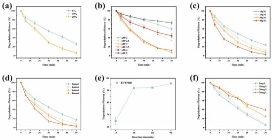 Effects of DPW filling ratio (a), initial pH (b), Fe2+ concentration (c), H2O2 dosage (d), reaction time (e), and 4-NP concentration (f) on 4-NP degradation efficiency in the ECTPBR. Experimental conditions: DPW filling ratio = 10%, pH = 3, [Fe2+] = 30μM, [H2O2] =4 mmol, reaction time = 60 min, [4-NP] = 10 mg/L, and Q = 100 L/h.