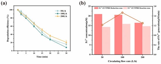 Effects of circulating flow rate on 4-NP degradation (a). The rate of Fe2+ generation in ECTPBR under different circulating flow rates (b). Experimental conditions: DPW filling ratio = 10%, pH = 3, [Fe2+] = 30 μM, [H2O2] = 4 mmol, reaction time = 30 min, [4-NP] = 10 mg/L, and Q = 100 L/h.
