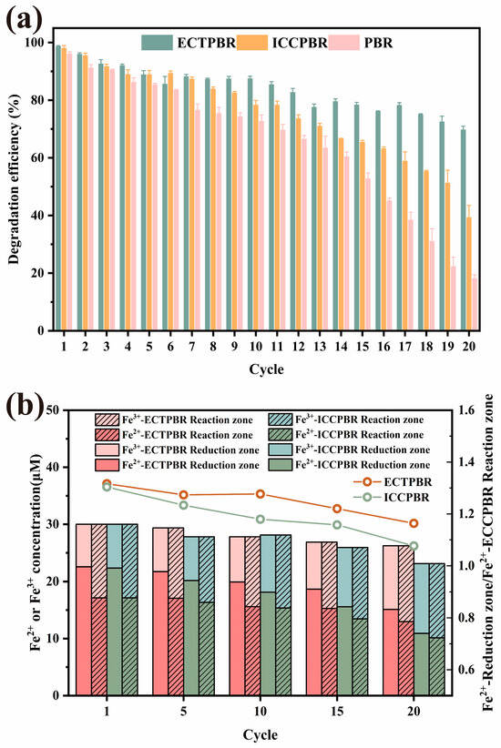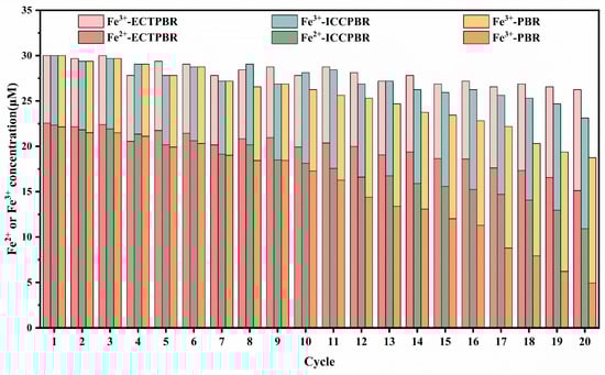 The temporal variations of Fe2+ and Fe3+ concentrations in the three reactors are shown in Figure 6. At the initial stage, all three reactors contained sufficient W0 and W4+ on DPW, resulting in negligible differences in total iron concentration. However, as the reaction progressed, the total iron concentrations in the ECTPBR, ICCPBR, and PBR gradually decreased, reaching 26.25 μM, 23.12 μM, and 18.75 μM, respectively, after 20 reaction cycles. These differences can be attributed to whether H2O2 directly reacted with DPW and the varying rates of active component loss from DPW. Additionally, the concentration ratio of Fe2+ to Fe3+ in all reactors declined over time. Initially, the ratios were 3.03, 2.92, and 2.82 for the ECTPBR, ICCPBR, and PBR, respectively. By the 16th cycle, the concentration ratio of Fe2+ to Fe3+ in the PBR dropped below 1, while in the ECTPBR and ICCPBR, it declined to 1.35 and 0.89, respectively, by the 20th cycle. After 20 cycles, the reaction solutions in all reactors were neutralized to pH 7, and the amount of iron sludge produced was measured (Figure S2). The iron sludge concentrations in the ECTPBR, ICCPBR, and PBR were 11.97, 26.45, and 34.65 mg/L, respectively. Compared to PBR, the iron sludge formation in ECTPBR and ICCPBR was reduced by 65.45% and 23.60%, respectively. This finding highlighted the improved iron-ion recycling efficiency in the two-stage and compartmentalized reaction strategies, with ECTPBR demonstrating the most effective iron cycling performance. Although the ECTPBR produced less sludge, the accumulated solid waste still contained iron and tungsten, which may pose environmental concerns if not properly managed [40,41]. Given the presence of valuable metals, converting ECTPBR sludge into reusable catalysts via alkaline treatment and thermal calcination [42] could be a promising future direction.