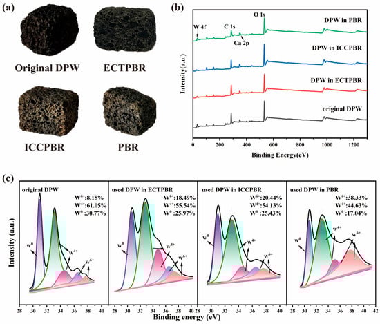Changes in DPW before and after the reaction in the ECTPBR, ICCPBR, and PBR: photograph (a), XPS survey spectrum (b), high-resolution W 4f spectra (c).