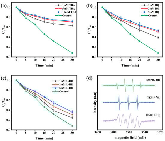 To identify the ROS involved in the degradation of 4-NP in the ECTPBR, quenching experiments were conducted using TBA, BQ, and L-HD as scavengers for ·OH, ·O2−, and 1O2, respectively [44,45]. Figure 8a shows that the degradation efficiency of 4-NP decreased by 55.22%, 62.51%, and 67.01% after the addition of 1 mM, 5 mM, and 10 mM TBA, respectively, indicating that ·OH played an important role in this process. Figure 8b shows that increasing the BQ concentration from 0 to 5 mM reduced 4-NP degradation efficiency from 91.97% to 47.14%, with the corresponding k decreasing from 0.0792 to 0.0208 min−1. Similarly, as shown in Figure 8c, increasing L-HD concentration (0–5 mM) also led to a gradual decline in 4-NP degradation efficiency. However, the inhibitory effect of L-HD was less pronounced compared to those of TBA and BQ, suggesting that while 1O2 was generated in the system, it was not the dominant ROS. Furthermore, the EPR experiments were performed using TEMP and DMPO as trapping agents to detect the ROS generated in the ECTPBR (Figure 8d). The characteristic signals of DMPO-·OH, TEMP-1O2, and DMPO-·O2− adducts were distinctly detected, confirming the presence of ·OH, ·O2−, and 1O2 in the ECTPBR. These findings indicated that the degradation of 4-NP in the ECTPBR involved a synergistic effect of ·OH, ·O2−, and 1O2, with ·OH playing a dominant role, which was a typical characteristic of the co-catalytic Fenton reaction.