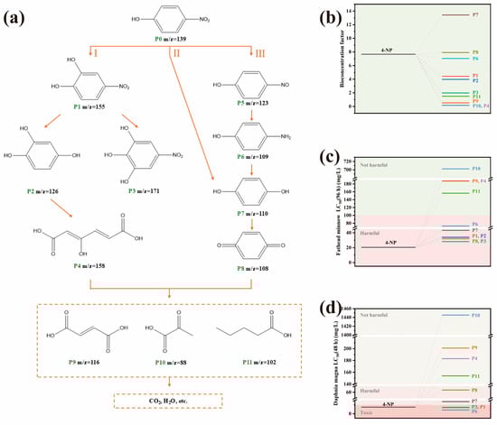 Possible pathways of 4-NP degradation in the ECTPBR (a). Bioconcentration factor (b), fathead minnow LC50 (96h) (c), and Daphnia magna LC50 (48 h) (d) of 4-NP and its degradation intermediates.