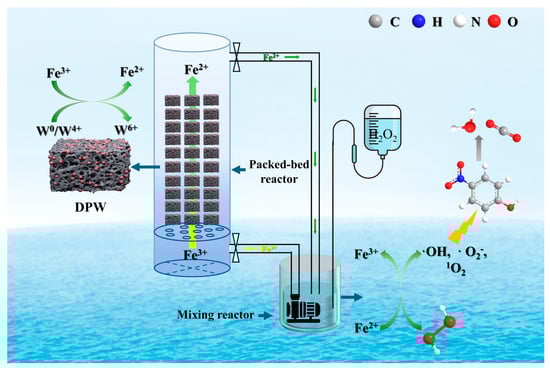 Based on the findings above, a schematic diagram illustrating the proposed mechanism of 4-NP degradation in the ECTPBR is presented in Figure 10. The ECTPBR consisted of a packed-bed reactor and a mixing reactor. In the mixing reactor, H2O2 was continuously added at a controlled rate based on stoichiometric calculations. Fe2+ rapidly reacted with H2O2 to generate ·OH, while being oxidized to Fe3+ (Equation (4)). Additionally, Fe2+ can react with O2 to produce ·O2− (Equation (5)). The interconversion between ·OH and ·O2− also generated 1O2 (Equations (6) and (7)). Under continuous attack by ROS (Equation (8)), 4-NP was gradually transformed into less toxic intermediates and ultimately mineralized into CO2 and H2O. Fe3+ was then transported via a pump to the packed-bed reactor, which was packed with DPW. The exposed W0 and W4+ sites on the DPW surface acted as electron donors, effectively reducing Fe3+ to Fe2+while being oxidized to W6+ (Equations (9) and (10)). This process played a key role in sustaining the Fe3+/Fe2+ redox cycle critical for continuous ·OH generation. In addition, W6+ could be partially reduced back to W4+ by H2O2 (Equation (11)), contributing to the regeneration of active sites. The regenerated Fe2+ flowed out from the top of the reactor, returning to the mixing reactor to activate H2O2 and sustain pollutant degradation. The combination of the packed-bed and mixing reactors effectively separated the Fe3+ reduction and Fenton reaction, minimizing side reactions associated with DPW-mediated H2O2 activation [16], thereby enabling the long-term operation of the co-catalytic Fenton system. The external circulation and two-stage packed-bed design enhanced the contact between the reaction solution and DPW, facilitating mass transfer between Fe3+ and DPW and increasing reaction efficiency. Additionally, the continuous dilution effect of circulation improved the reactor’s resistance to shock loads. A flow control valve at the reactor’s base allowed precise regulation of the influent flow rate. In the ICCPBR, an inner-outer tube design was adopted to separate the Fenton reaction from Fe3+ reduction. Unlike the ECTPBR, ICCPBR operated at a higher internal flow velocity, leading to significant hydraulic flushing of DPW during the reaction. This high-flow condition accelerated the loss of active sites on the DPW surface, thereby compromising reaction stability and long-term performance.