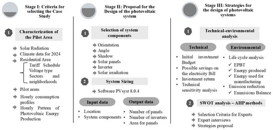 This research analyzes the energy consumption of residential housings in the Santa Elena province. Given the high energy demand, this study proposes pilot PV systems as a sustainable alternative for the diversification of the energy matrix. A mixed qualitative–quantitative methodology was used, with a correlational approach to variables [64,65]. Key stages in PV panel design were analyzed by selecting three distinct consumption scenarios ranging from 200 to 2500 kWh per month on average, each drawn from a representative neighborhood in the province’s three cantons. Electricity bills were reviewed, their values were recorded, and patterns, trends, and relationships were identified [66]. This research followed the methodological framework shown in Figure 1, which comprises three stages: (i) determining case selection criteria; (ii) designing the distributed-generation system with PVsyst software (version 8.0.4) [67], which allows the simulation, sizing, and performance analysis of PV solar systems [68]; and (iii) identifying strategies for PV system design based on sustainability and environmental aspects, including a SWOT analysis conducted through focus group interviews to determine acquisition and installation costs for the PV system and potential savings on electricity bills. It is essential to validate the qualitative results of the SWOT analysis; therefore, the AHP method, a valuable tool for complex decision-making, was applied to compare strategic factors by assigning weights under expert criteria [69]. This methodological integration strengthens the objectivity of the analysis, prioritizes priorities, and reduces the subjectivity of individual criteria.