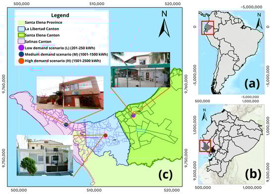Study area characterization. (a) Ecuador macro scale of South America (red frame); (b) location of the province of Santa Elena (red frame) within the Ecuadorian territory; (c) geographical distribution of the selected residential scenarios in the Santa Elena province.