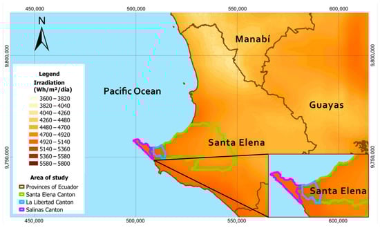 - Prevailing solar radiation: Data based on the Solar Atlas published by the Ministry of Energy and Mines of Ecuador [71].