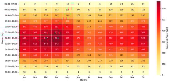 The highest solar generation occurs between 11:00 and 14:00 [114], with peaks exceeding 660 Wh in March and April. In contrast, July and August see a decrease due to cloud cover (Figure 5). This diurnal profile enables the application of net metering schemes, compensating for nighttime consumption without requiring batteries, thereby improving the system’s profitability. By integrating the hourly demand and generation profiles, the technical design is optimized, estimating surpluses and improving the viability of the residential system. Using data from the Solar Atlas of Ecuador [115], an hourly and monthly generation profile was obtained to compare energy supply and demand throughout the day.