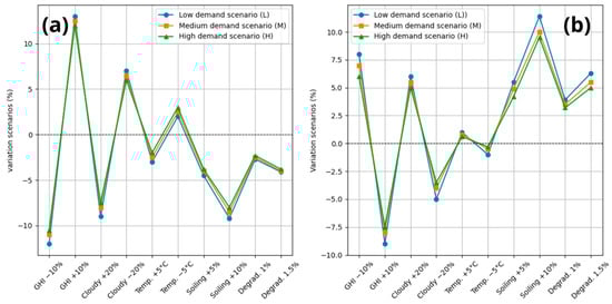Sensitivity analysis of climate and operational parameters on PV systems performance. (a) Sensitivity analysis, energy production (%); (b) Sensitivity analysis, LCOE (%).