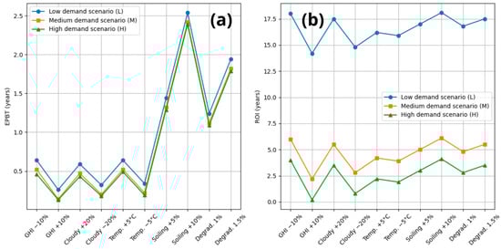 The EPBT measures the years required for the system to generate energy equivalent to that used in its manufacture and is more sensitive to fouling (+10%) and annual degradation (+1.5%), reaching up to 2.5 years in the L scenario. In contrast, in the M and H scenarios, it remains below two years (Figure 7a). Regarding the ROI, the lower-consumption systems have longer payback periods (15–18 years), while in the H scenario, it is reduced to less than 5 years, even under adverse conditions (Figure 7b). It demonstrates that PV systems are more cost-effective and efficient on a larger scale and that proper maintenance is key to optimizing their long-term performance.