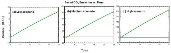 REE is defined as the ratio between the energy generated by the system and the energy consumed in its operation and maintenance phases [104]. This parameter was calculated to assess the system’s performance in terms of energy use, allowing for a comparison across the three scenarios (L, M, and H) and identifying opportunities for improvement. REE also helps determine whether the system meets efficiency standards and justifies potential adjustments in operation or maintenance, thus evaluating the system’s energy performance over its useful life.