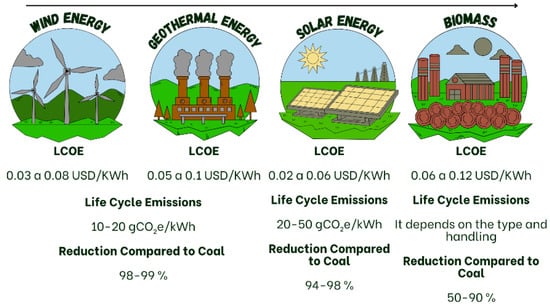 Renewable sources include (i) solar energy, which is converted directly into electricity [13]; (ii) wind energy, which is produced through uneven atmospheric heating [14]; (iii) hydrogen, a clean fuel that still requires a high energy intensity to produce; (iv) geothermal energy, originating from the planet’s internal heat [15]; (v) tidal energy, produced by the gravitational effect exerted by the Moon and the Sun on the oceans; and (vi) biomass, which is produced from biodegradable organic matter [16] and requires careful management to avoid environmental impacts [17,18]. Although these sources are reliable, they depend on specific geographic and climatic conditions. By 2030, they are expected to provide nearly 40% of global electricity [19].