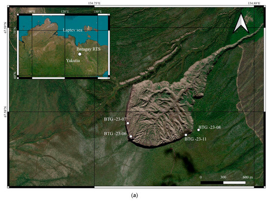 Batagay RTS, placed in northern Yakutia, measures roughly 1 × 2 km, with the main wall of the exposure extending over 1.6 km (Figure 1). A stratigraphic sequence of frozen deposits exceeds 80 m in thickness, covering a time span from 250 to approximately 600–700 Kyr (as estimated through various research methods [29]). The Batagay RTS (67.58° N, 134.77° E), located in 10 km southeast of the Batagay settlement in Sakha (Yakutia, Russia), began to develop from a series of thermal erosion gullies at the end of the 1960s [19] with a gradual increase in the rate of degradation. By 2015, it reached the width of 840 m with an overall area of more than 70 ha [12,30]. Then, the rate of the retreat of the exposure’s walls somewhat slowed [31]. Presently, the maximum width is about 1 km [18]. The Batagay RTS is found in the Kirgillyakh-Khatyngnakh saddle, mainly between 260 and 330 m a.s.l. This area has a sharply continental climate of the subarctic zone [32]. The mean annual air temperature is –11.6 °C, and the annual precipitation is 210 mm. The region belongs to the zone of continuous permafrost with a thickness of about 300 m, and the mean annual ground temperature in the upper part of the permafrost varies from –5.5 to –7.0 °C [32]. The thickness of the active layer varies from 0.6–0.8 to 1.4–1.6 m depending on the soil-vegetation cover [33]. The permafrost section consists of disperse sediment units underlain by metamorphosed slate bedrock of the Triassic period [12] appearing on the surface only in the deepest parts of the section and in the streambeds of springs inside the slump.